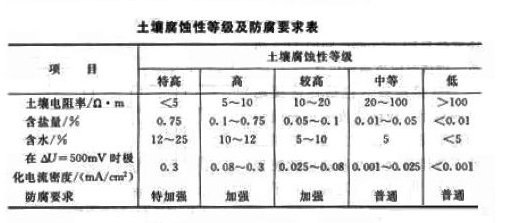 土壤腐蝕影響影響著土壤的電阻率,因此在選址時(shí)應(yīng)適當(dāng)考慮土壤腐蝕性與電阻率的關(guān)系,土壤腐蝕性等級及防腐要求如下表。